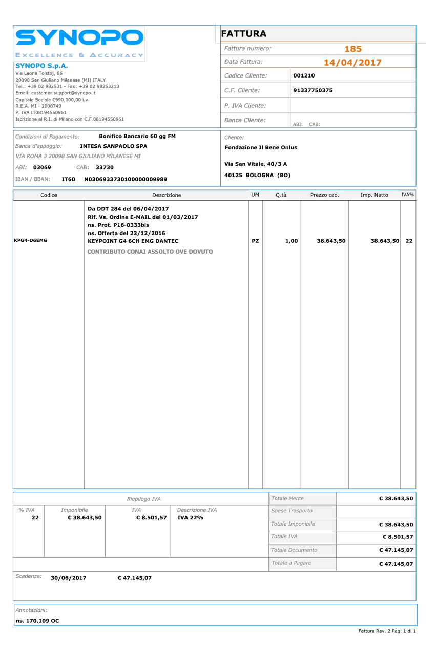 Sempre nell’ottica della massima trasparenza riportiamo la fattura e la lettera di ringraziamento per la cessione in comodato d’uso: