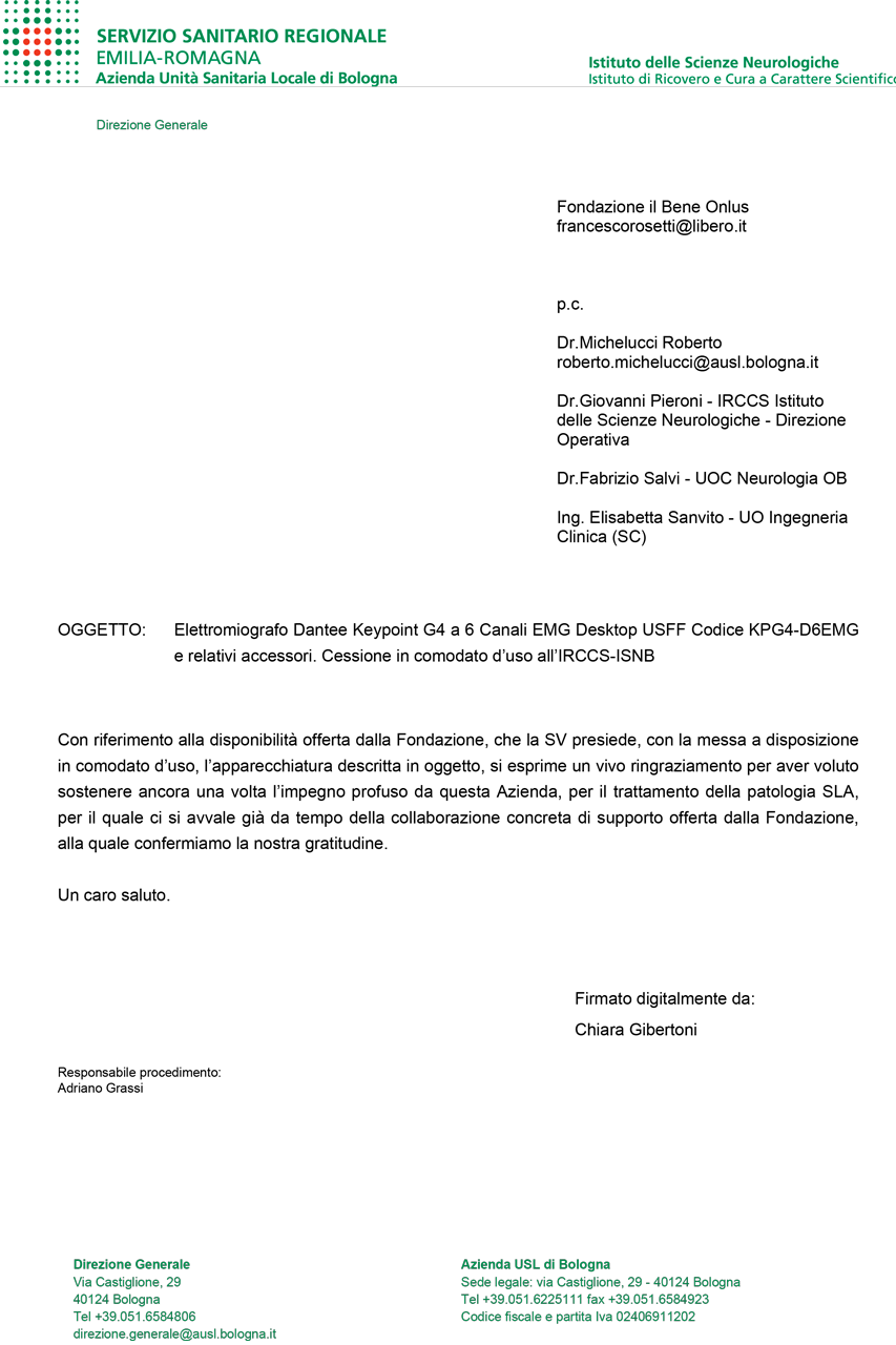 La Fondazione Il Bene riconferma il rapporto di sinergia e di reciproco supporto con l’Ospedale Bellaria – IRCSS Istituto delle Scienze Neurologiche, attraverso la cessione in comodato d’uso gratuito di questa apparecchiatura; perché uniti possiamo impegnarci in modo incisivo nel trattamento della patologia SLA.